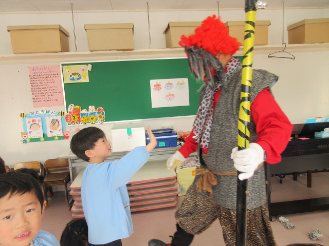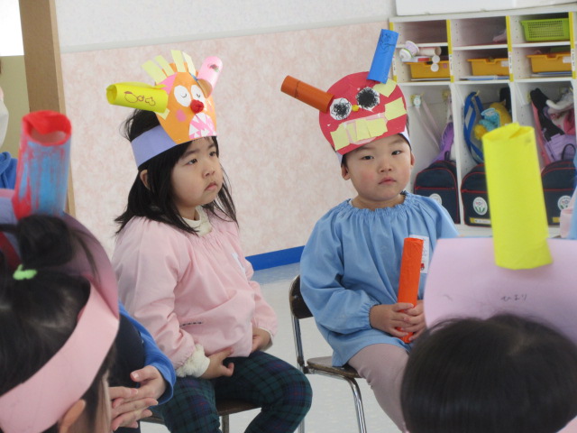 そして年中さん、年長さんの教室には毎年幼稚園に登場する赤鬼さん・青鬼さんがやってきました。