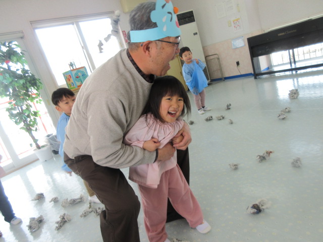 そして年長さんにとっては幼稚園生活最後の豆まき。