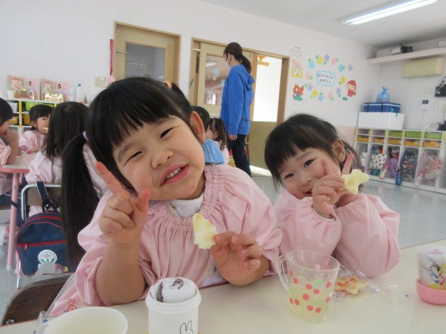 頑張ったご褒美におせんべいとリンゴジュースをいただきました、美味しかったね♡