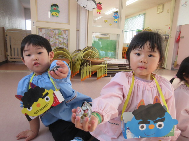 いよいよ2月がスタートしましたね。 暦の上では春とはいえ、まだまだ寒さが続いています。 園では手洗い・うがいを丁寧に行い、感染対策をしっかりしながら子どもたちの健康と笑顔を守っていきたいと思います。 そして節分の日。 各クラスをのぞいてみると個性豊かなお面や豆入れが飾ってあり、「強そうでしょ?」 「今日お面付けるんだよ!」 「ブロックで鬼…