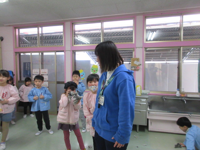和やかな雰囲気の中、楽しく過ごしていた年中さんでしたが予想外あらわれたので「うわ〜!」と驚き、思わず固まってしまうお友だちもいました。