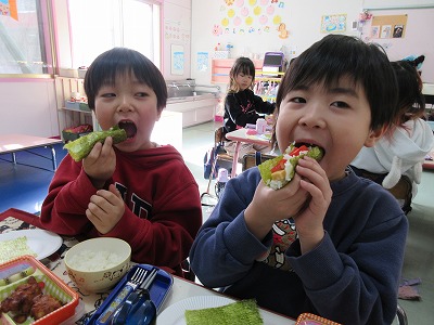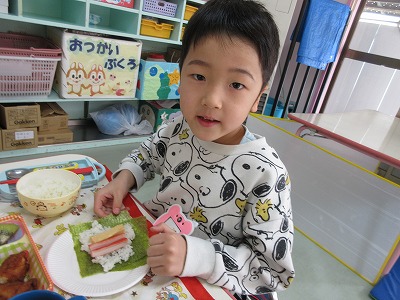 自分で作った恵方巻を口いっぱいに入れて頬張る笑顔にはたくさんの福が訪れているようでした。